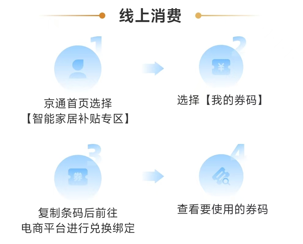 上述4类智能家居产品采用“立减补贴”模式。个人消费者通过“京通”小程序进入“智能家居补贴”专区,按需领用智能家居产品补贴资格券码,通过政策参与企业购买上述智能家居产品时,于订单支付环节享受立减补贴,线上线下消费享受同等补贴力度。具体参与政策商户名单可通过“京通”小程序查询。
