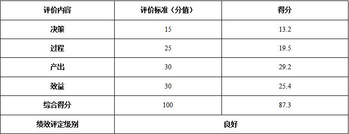 经专家评议,该项目综合评价得分87.30分,其中:项目决策13.20分,项目过程19.50分,项目产出29.20分,项目效益25.40分,绩效级别评定为“良好”。