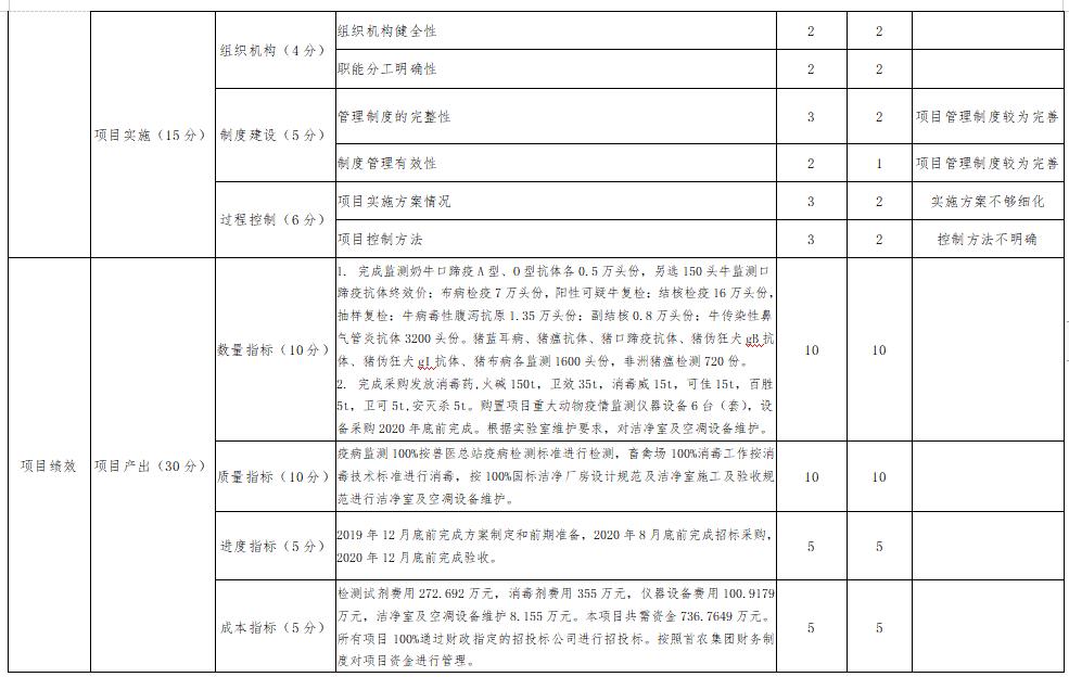 1.项目管理过程问题:实施方案需进一步细化。项目根据《2020年动物疫病防控项目实施方案》开展,但方案内容笼统,对项目实施具体时间进度、控制措施等方面均未详细说明,实施方案可操作性不强。