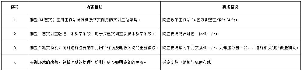 项目为2020年新增项目,目标为升级改造轻工分院影视后期制作实训室,主要内容及完成情况见表1。截至2020年12月31日,该项目主要工作已完成,已投入教学供师生使用。