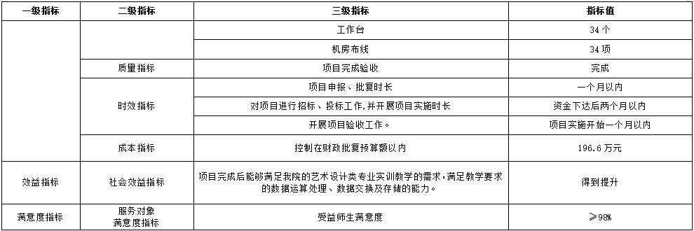 项目主要通过开展工作站购置、实训室多媒体教学系统搭建、网络系统更新、实训环境改善等工作,实现后期制作剪辑实训室的整体升级改造,满足师生日常教学需求。项目绩效目标围绕项目内容设置,涵盖工作内容、预期实现效果等,绩效目标与项目内容相匹配。