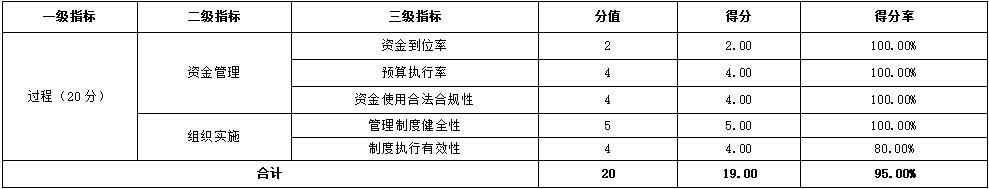 项目财务和业务管理制度健全,批复资金全额到位,资金执行率100%,资金使用合规。但项目过程管理仍存在合同要素约定不够清晰、项目验收不够规范等问题。该指标分值20分,得分19分,得分率95%。评分见表5。