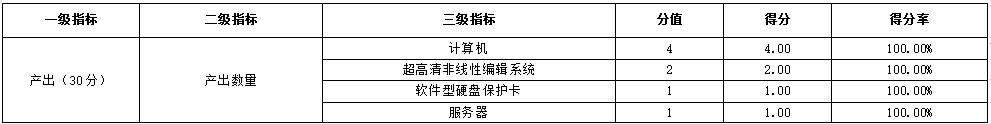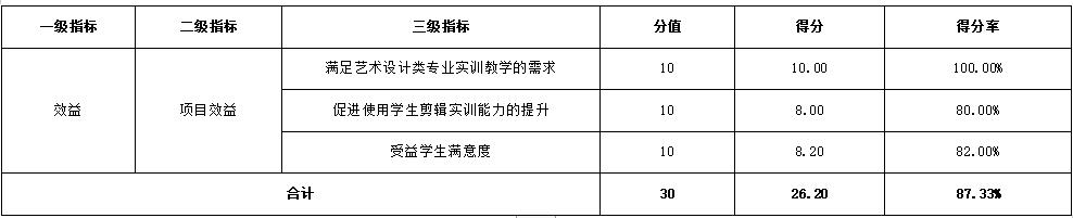 通过项目实施,为艺术设计类专业实训教学提供了有力保障,学生能够使用更符合实训需求的软硬件设施开展后期制作剪辑实训,有助于学生实践能力的提升,强化教学质量,为培养更高水平技能人才提供了硬件和软件保障,具有较强的社会效益。效益指标总分30分,得分26.2分,得分率87.33%。得分情况见表8。