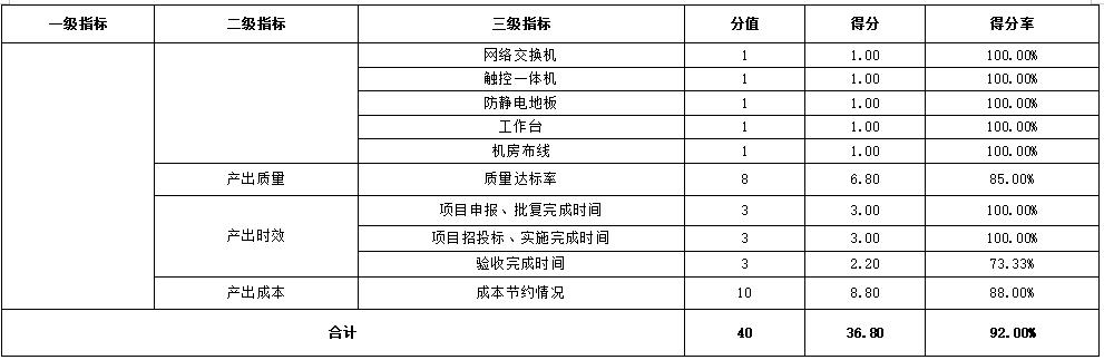 项目年度主要产出按照预期目标完成,各项产出质量基本达标,项目实施过程中采取了一定成本节约措施,但部分配套设备质量不如预期,采购物资到货后未及时开展验收入库,存在质量风险。该指标分值40分,得分36.8分,得分率92%,评分见表6。