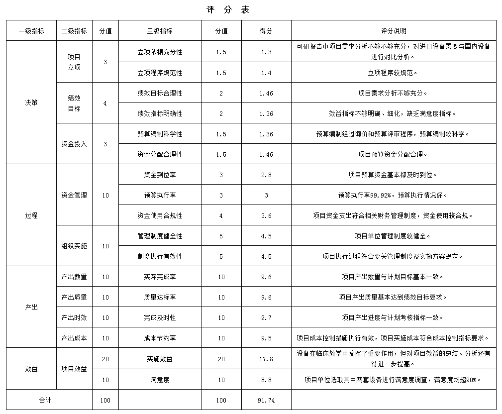儿童医院2020年“临床教学-设备购置”项目绩效评价综合得分91.74分,其中:决策8.34分,过程18.40分,产出38.40分,效益26.60分,项目综合绩效评定结论为“优秀”。