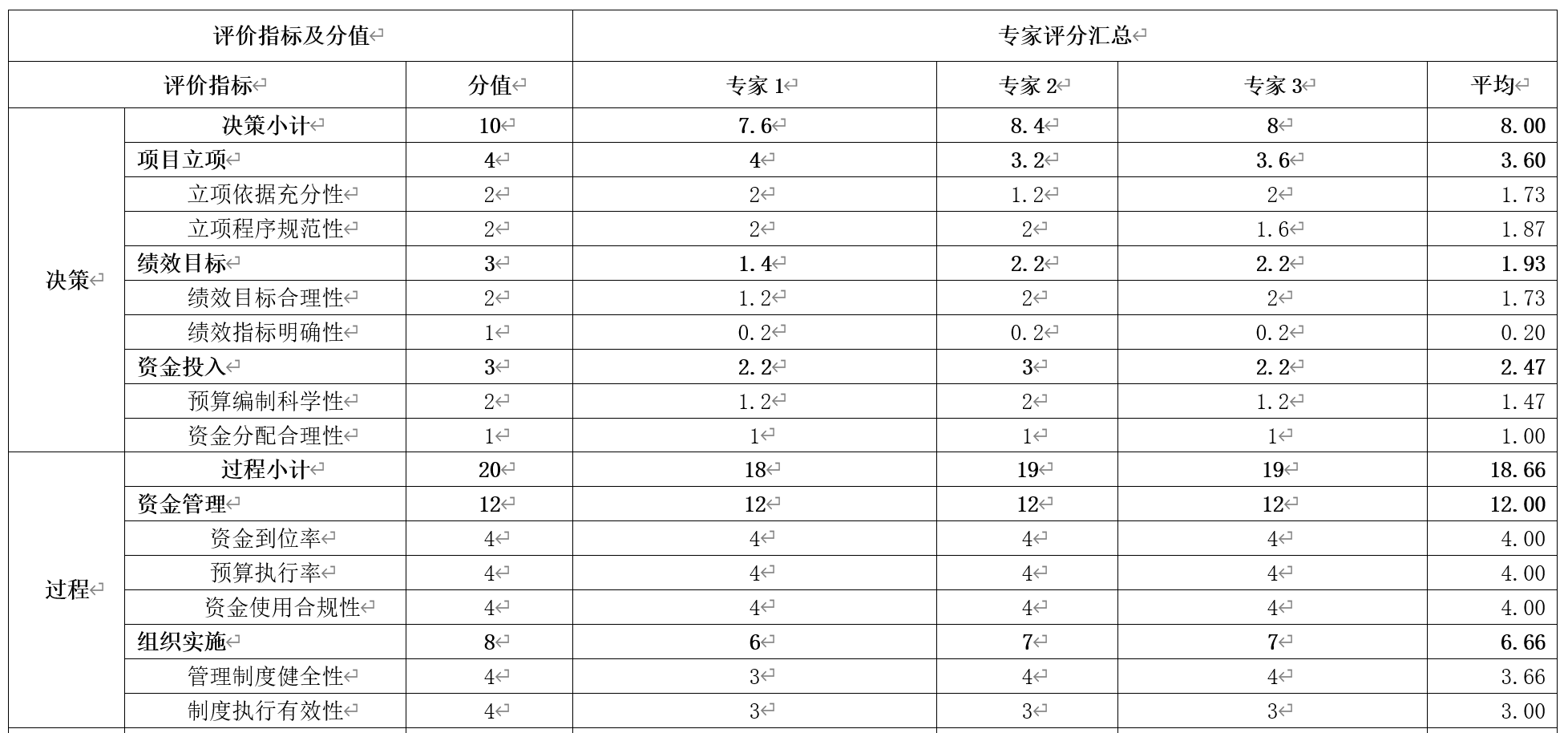 根据项目特点,评价工作组遴选3名专家(其中管理专家1名,业务专家1名,财务专家1名),组成评价专家组,对项目进行评议。专家针对关注的问题与项目单位进行充分讨论和沟通,并就指标体系内容进行评分,出具评价意见。
