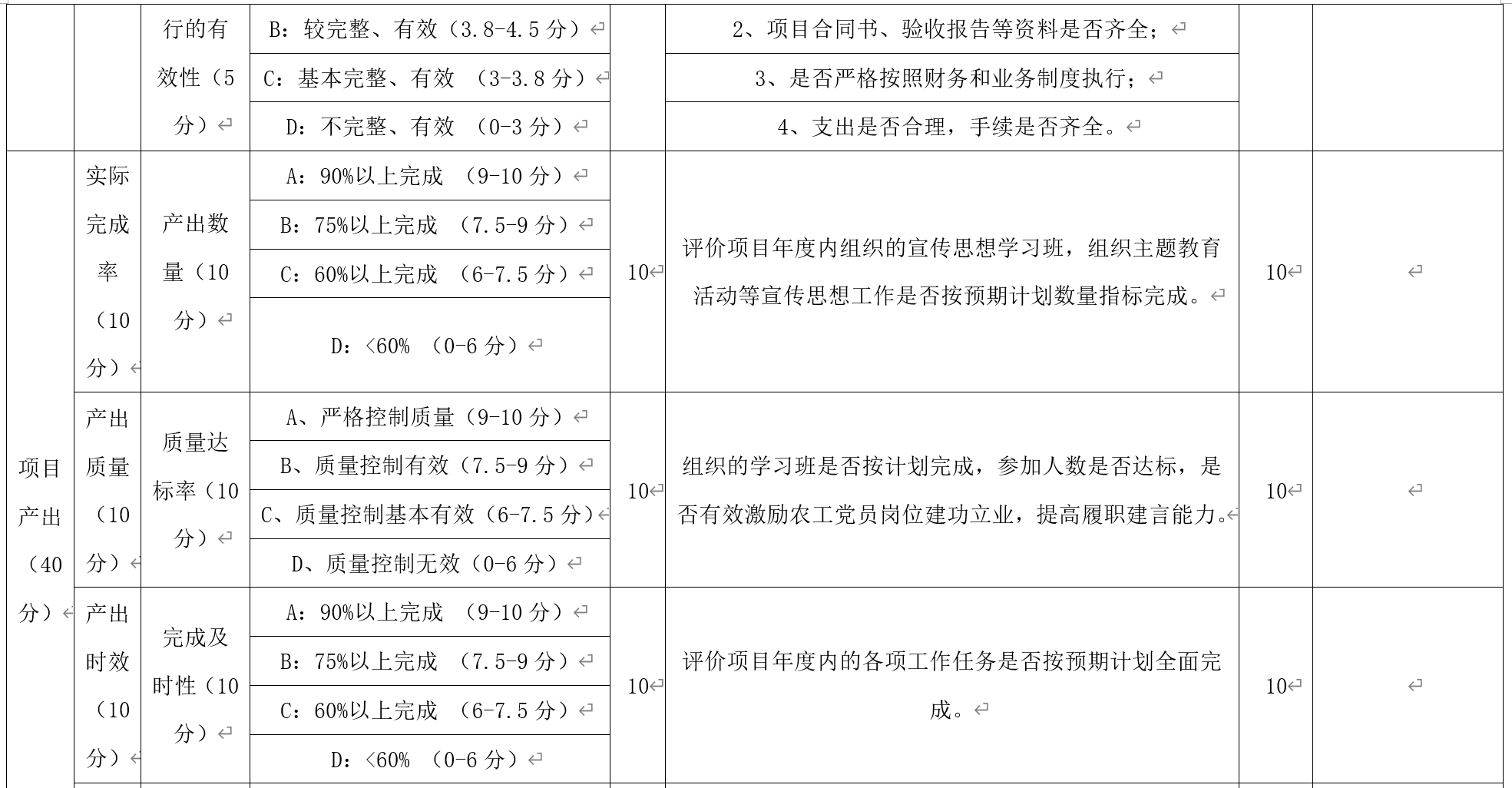 评价工作组结合项目特点,针对项目实施部门提供资料,参照北京市财政支出项目绩效评价指标体系,明确评价标准。按照"相关性、重要性、可比性、系统性"原则,结合该项目的特点,设计三级明细指标,确定了"农工党员宣传思想项目经费"的绩效评价指标体系。