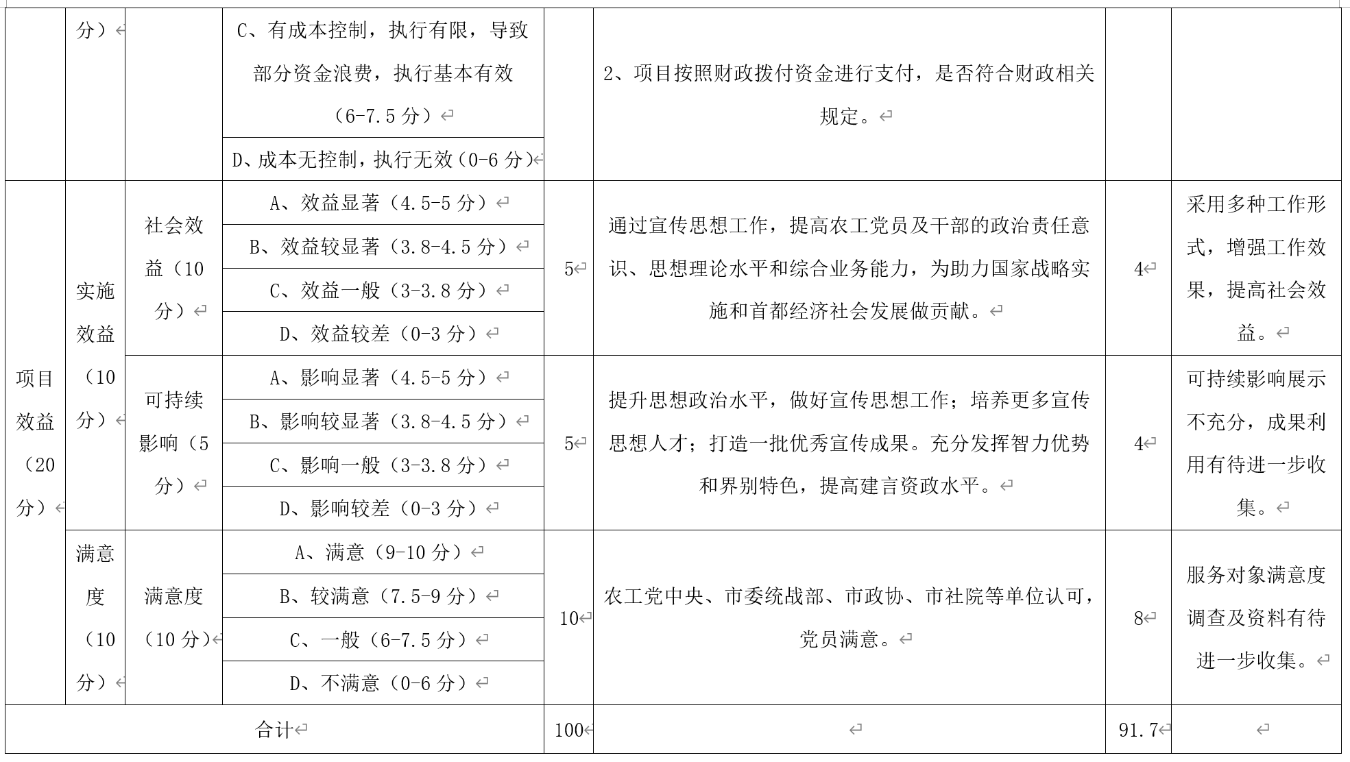 中国农工民主党北京市委员会对2020年度部门项目支出实施绩效评价,评价项目4个,占部门项目总数的44.44%,涉及金额103.03万元。部门评价项目1个,对照绩效评价指标体系标准,农工党员宣传思想项目经费评价分数91分。单位自评项目3个,后备骨干学习班经费自评分数83分、社会服务项目经费自评分数86分、重点调研课题项目经费自评分数93分。从评价情况看,4个项目立项符合部门职责和相关管理规定,绩效目标合理,项目业务管理制度较健全完善,业务监控有效性较好,各项业务工作有序开展,财务管理制度规范,建立了相应的财务监控措施和手段,有效防控各类财务风险;任务完成质量较高,时效性强,产出、效果完成情况较好;通过项目实施,社会效益较显著。