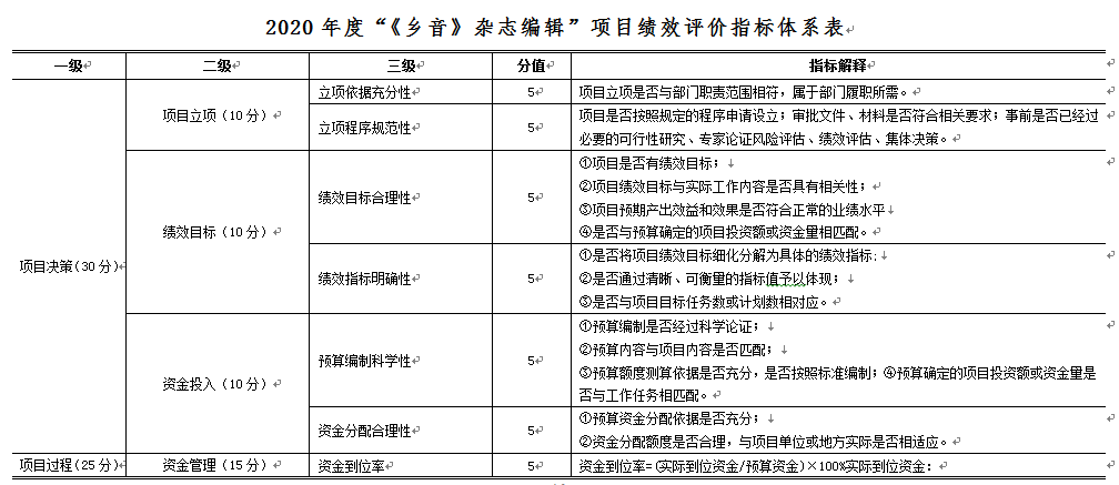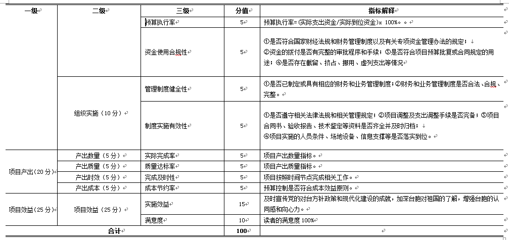 绩效评价指标体系主要包括项目决策、项目过程、项目产出、项目效益4个方面,满分100分。一是决策指标(30分),主要评价项目立项、绩效目标、资金投入等内容;二是过程指标(25分),主要评价资金管理和组织实施等内容;三是产出指标(20分),主要评价项目产出数量、产出质量、产出时效和产出成本等内容;四是效益指标(25分),主要评价实施效益和满意度等内容。具体内容见下表: