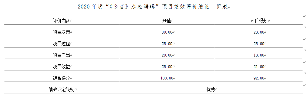 北京市台湾同胞联谊会2020年度"《乡音》杂志编辑"项目,项目绩效评价综合得分92分,其中项目决策28分、项目过程25分、项目产出18分,项目效益21分,绩效评定结论为"优秀"。