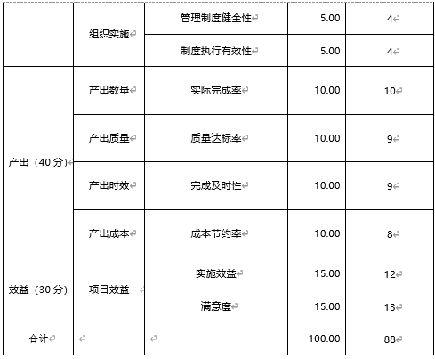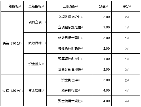 根据2129号文、2146号文等相关文件精神,结合项目特点,在评价机构与项目单位充分协商的基础上,评价工作组细化了项目的绩效评价指标体系。评价指标体系总分值为100分,其中项目决策10分,项目过程20分,项目产出40分,项目效益30分。项目绩效评价指标体系详见下表。