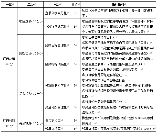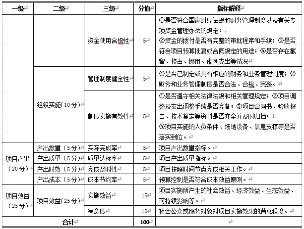绩效评价指标体系主要包括项目决策、项目过程、项目产出、项目效益4个方面,满分100分。一是决策指标(30分),主要评价项目立项、绩效目标、资金投入等内容;二是过程指标(25分),主要评价资金管理和组织实施等内容;三是产出指标(20分),主要评价项目产出数量、产出质量、产出时效和产出成本等内容;四是效益指标(25分),主要评价实施效益和满意度等内容。具体内容见下表: