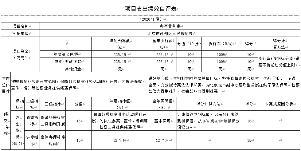 通州院2020年度"办案业务费2"项目,项目绩效评价综合得分91.00分,其中项目决策27.00分、项目过程23.00分、项目产出20.00分,项目效益21.00分,绩效评定结论为"优秀"。