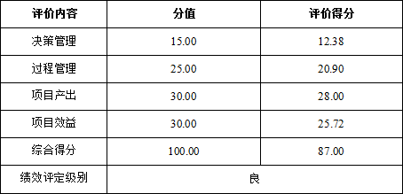 经专家评议,该项目综合评价得分87.00分,其中:决策管理12.38分、过程管理20.90分、项目产出28.00分、项目效益25.72分,绩效评价结果为“良”。