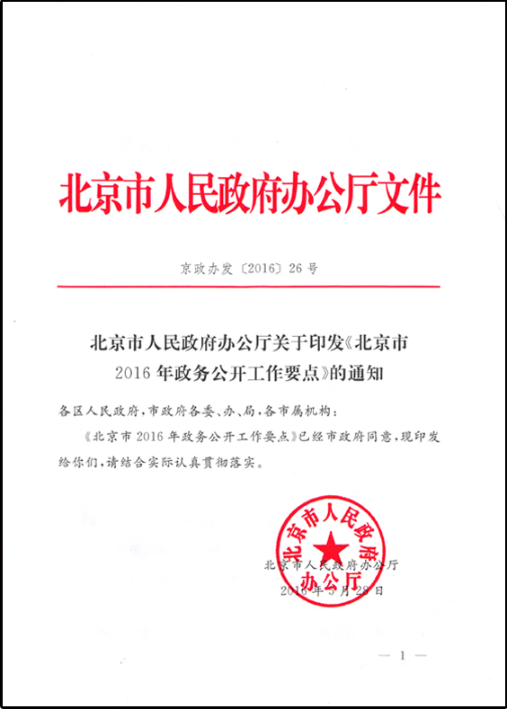 The report contains key points of the work of Beijing Municipality on government information disclosure in 2016; the disclosure of information in key areas; problems and measures for improvement; and related data on voluntary information disclosure, responses and interpretation, disclosure upon requests (including information on the non-open contents, fees and fee relief), administrative reconsideration, administrative litigation, and tip-offs, etc.