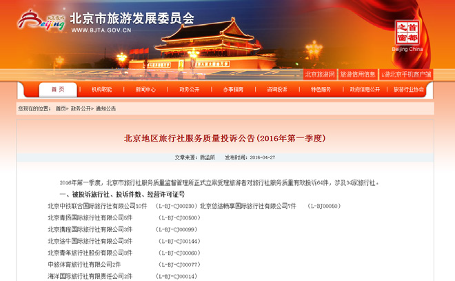 推进旅游市场监管信息公开。发布旅游行业"黑白名单",建立虚假旅游网站快速核查、商业推广前置审核及旅游委官网置顶"三项机制",建立定期旅游投诉信息公示制度,公布北京"一日游"旅行社推荐名单,公示非法旅游网站对外不法招徕电话等。