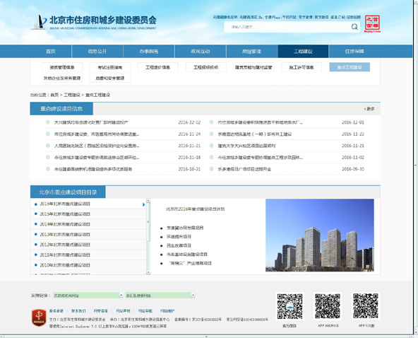 推进重大规划和建设项目信息公开。围绕北京城市总体规划、城市副中心规划建设、查处违法建设专项行动、地理信息普查、各类规划建设法规标准等多方面开展宣传解读工作,通过新闻发布会详细解读北京市空间战略规划和城市副中心规划的相关问题。公开2016年北京市重点建设项目目录,围绕京津冀协同发展、环境提升项目、基础设施建设、民生改善、"高精尖"产业项目,及时公布进展情况信息32篇。实时公开建设工程项目的许可、备案信息,通过"北京市建筑市场信息公开平台"公开建设工程的招投标、合同备案、合同履约、施工许可、竣工备案等信息。及时公开建设工程项目的质量监督和执法检查信息。