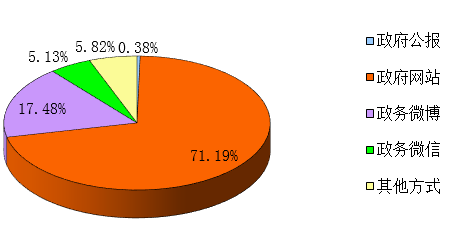 通过不同渠道和方式公开政府信息的情况,其中,通过政府公报公开政府信息4899条,占总数的0.38%;政府网站公开政府信息921908条,占总数的71.19%;政务微博公开政府信息226278,占总数的17.48%;政务微信公开政府信息66479条,占总数的5.13%;其他方式公开政府信息75367条,占总数的5.82%。