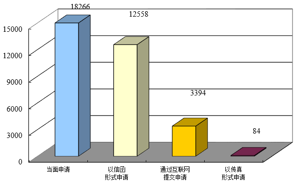 全市申请总数为34200件。申请方式中,当面申请18266件,占总数的53.25%;以传真形式申请84件,占总数的0.24%;通过网络提交申请3394件,占总数的9.89%;以信函形式申请12558件,占总数的36.62%。(因同一申请可以多种申请方式提出,故分类申请之和大于申请总数。)