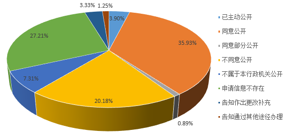 已答复的33149件申请中,"属于已主动公开范围"1293件,占总数的3.90%;"同意公开"11909件,占总数的35.93%;"同意部分公开"296件,占总数的0.89%。