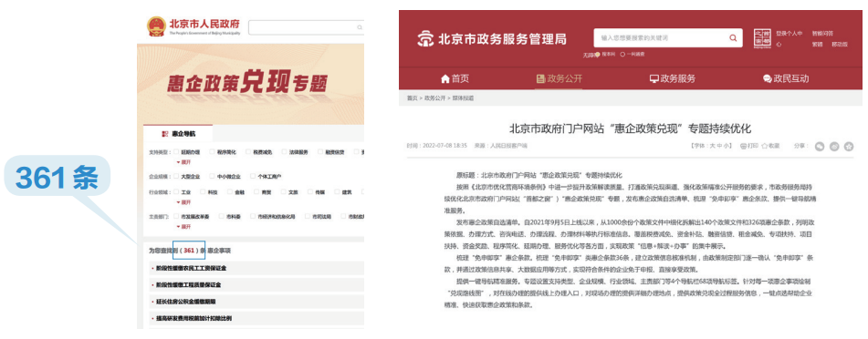 坚持信息精准推送,结合市工商联、中关村社会组织联合会等政策需求,为企业协会打造定制化政策推送服务。强化政策兑现,持续优化“惠企政策兑现”专题,细化拆解覆盖融资信贷、项目扶持、程序简化等多方面的165个政策和361项惠企条款,实现政策“信息+解读+办事”集成服务。
