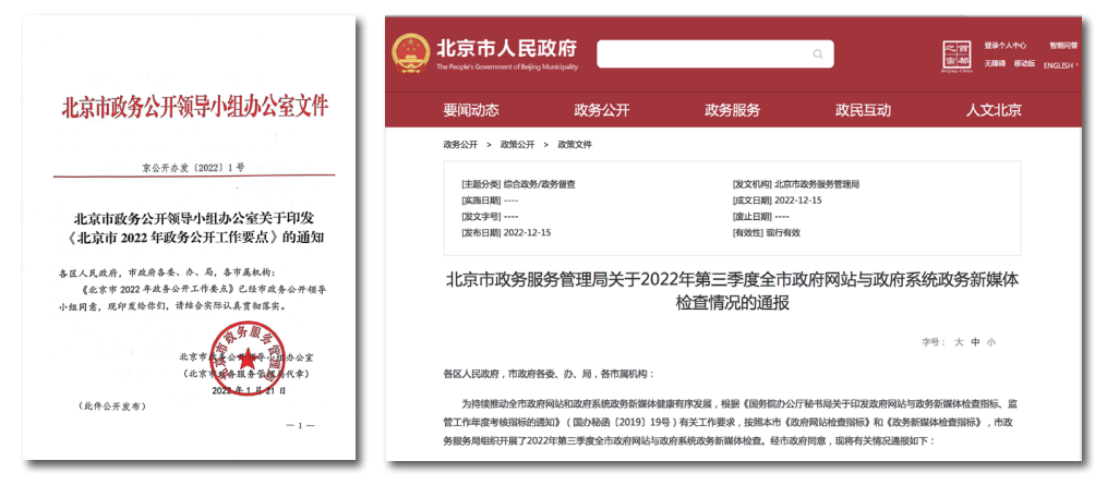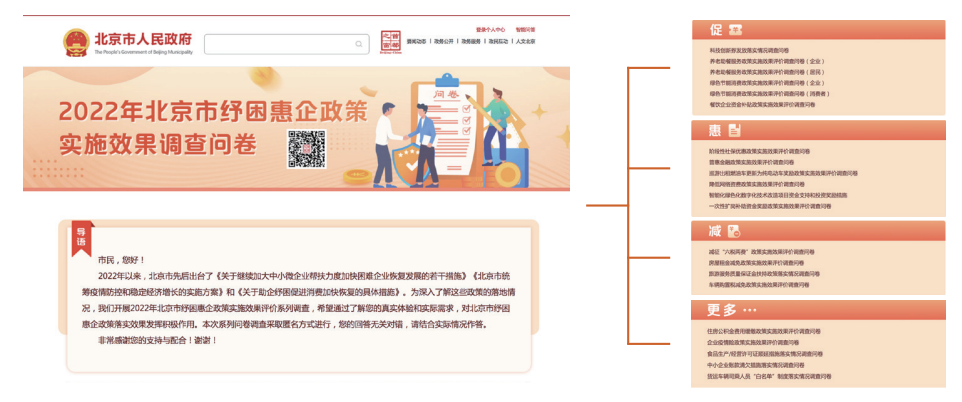 市政府门户网站和微信公众号上线“2022年北京市纾困惠企政策实施效果调查问卷”专题,开展社会评议。政府信息公开法定要求纳入绩效考核指标和第三方评估体系,年度内未发生需责任追究情形。