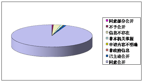 在已答复的1034项中,“同意公开”996项,占总数的96.32%;“同意部分公开”1项,占总数的0.1%;“不予公开”3项,占总数的0.29%;“信息不存在”21项,占总数的2.03%;“非本机关掌握”5项,占总数的0.48%;“非政府信息”1项,占总数的0.1%;“申请内容不明确”1项,占总数的0.1%;“已主动公开”6项,占总数的0.58%。