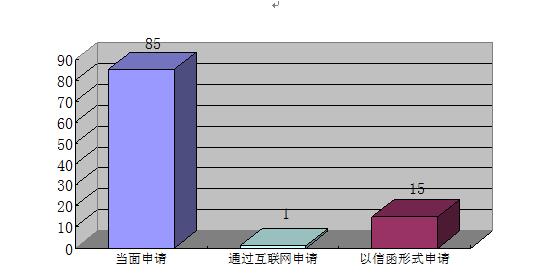2015年,我委申请总数为101件,申请方式中,当面申请85件,占84.16%;通过互联网申请1件,占0.99%;以信函形式申请15件,占14.85%。