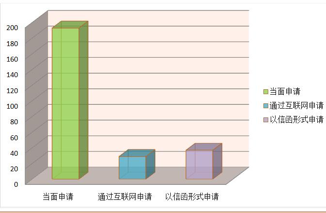 2016年,我委申请总数为259件,申请方式中,当面申请193件,占74.52%;通过互联网申请29件,占11.20%;以信函形式申请37件,占14.28%。