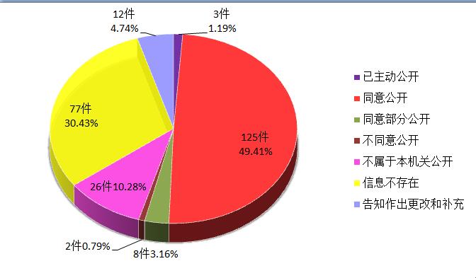 在已答复的253件中,“已主动公开”3件,占1.19%;“同意公开”125件,占49.41%;“同意部分公开”8件,占3.16%;“不同意公开(不是《条例》所指政府信息)”2件,占0.79%;“不属于本机关公开”26件,占10.28%;“信息不存在”77件,占30.43%;“告知作出更改和补充”12件,占4.74%。
