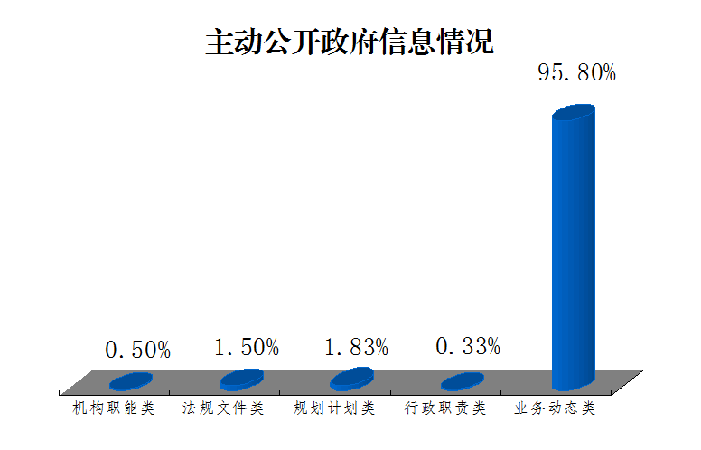 2016年,以政府网站为主要渠道,通过“政府信息公开专栏”公开政府信息共计601条,其中机构职能类3条,占0.5%;法规文件类9条,占1.5%;规划计划类11条,占1.83%;行政职责类2条,占0.33%;业务动态类576条,占95.8%。