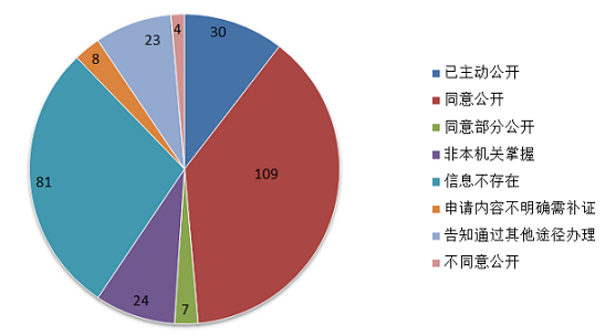 其中,不同意公开的4件中,2件因申请内容不属于《条例》所指政府信息,因此不予公开;另2件属于法律法规规定的其他情形。