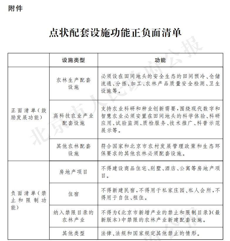 (一)正负面清单。点状配套设施用地必须依托本地农业资源,符合正负面清单中鼓励发展和禁止限制功能(附件),原则上仅允许建设必需的农业生产配套设施、高科技农业配套设施。各区应当结合本区实际情况,进一步细化正负面清单。